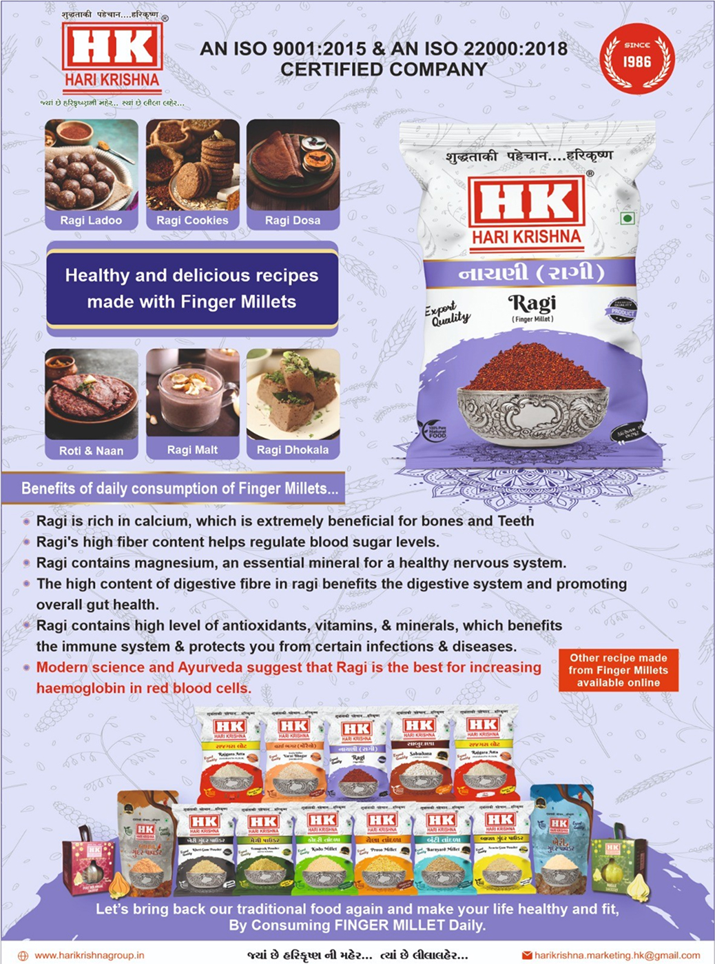 ફિંગર મિલેટ્સ (રાગી) એક ખૂબ જ પૌષ્ટિક અનાજ છે જે તેના સમૃદ્ધ કેલ્શિયમ, આયર્ન, પ્રોટીન અને ડાયેટરી ફાઇબર સામગ્રી માટે જાણીતું છે. તે હાડકાની મજબૂતાઈને ટેકો આપે છે, પાચનમાં સુધારો કરે છે અને સતત ઉર્જા સ્તર જાળવવામાં મદદ કરે છે. કુદરતી રીતે ગ્લુટેન-મુક્ત અને પચવામાં સરળ, રાગી સ્વસ્થ ભોજન, પરંપરાગત વાનગીઓ અને સંતુલિત આહાર માટે આદર્શ છે, જે તેને રોજિંદા પોષણ માટે એક સ્વસ્થ પસંદગી બનાવે છે.