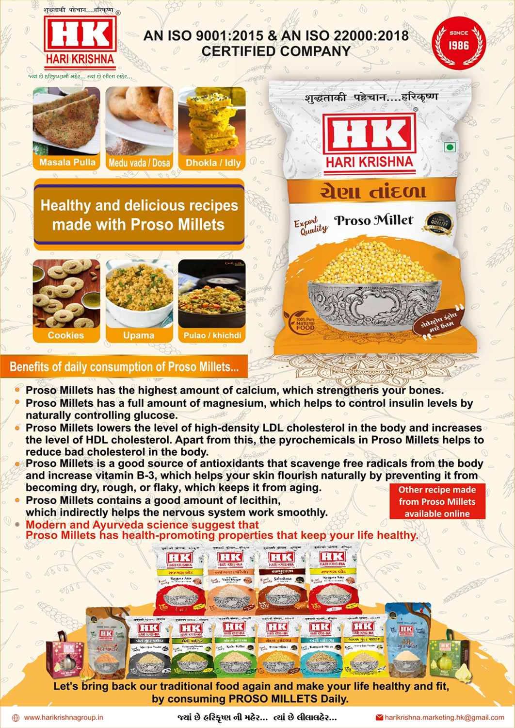 પ્રોસો મિલેટ એક પૌષ્ટિક પ્રાચીન અનાજ છે જે પ્રોટીન, ડાયેટરી ફાઇબર અને આવશ્યક ખનિજોથી ભરપૂર છે જે પાચન અને એકંદર સુખાકારીને ટેકો આપે છે. તેના હળવા પોત અને સરળ રસોઈ માટે જાણીતું, તે સતત ઊર્જા પ્રદાન કરે છે અને સંતુલિત આહારને પ્રોત્સાહન આપે છે. કુદરતી રીતે ગ્લુટેન-મુક્ત અને બહુમુખી, પ્રોસો મિલેટ સ્વસ્થ ભોજન માટે આદર્શ છે અને શુદ્ધ અનાજનો સંપૂર્ણ વિકલ્પ છે.